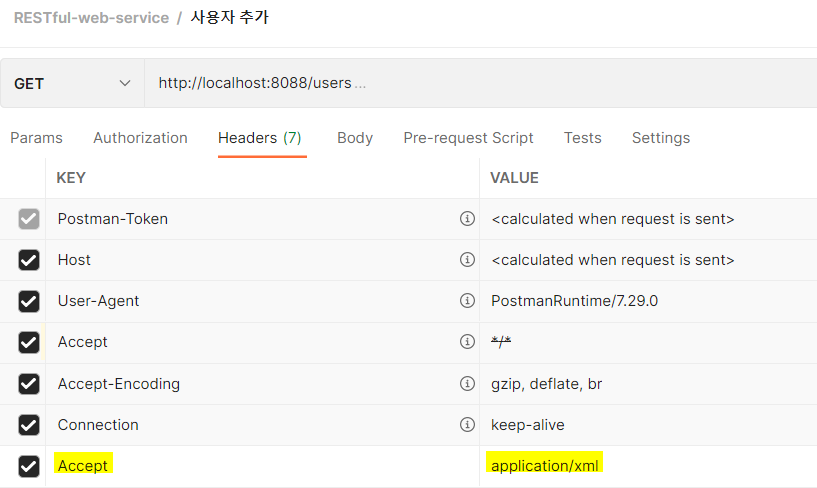 Postman header์์ key: Accept, value: application/xml๋ก ๋ณํ ์ xmlํ์ผ ํธ์ถ ๊ฐ๋ฅ