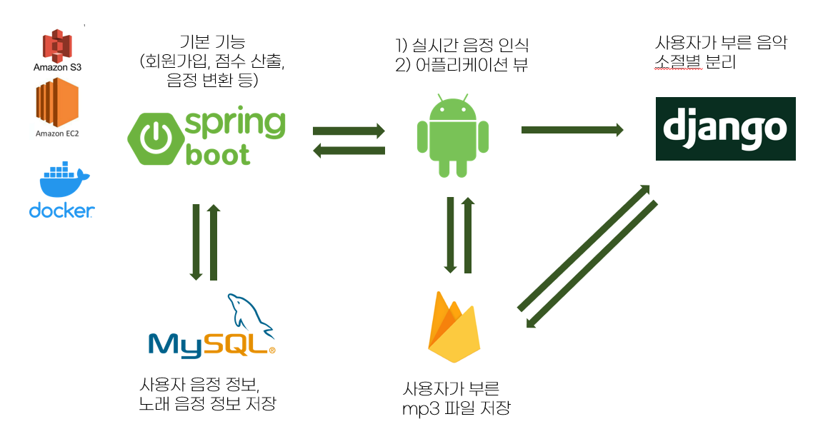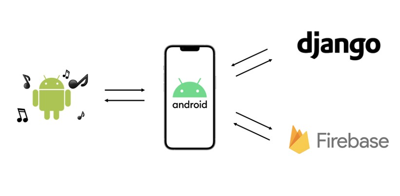 ์กธ์ ํ๋ก์ ํธ ๊ธฐํ์ด ๋๋๊ณ ์๋๋ก์ด๋ ๊ฐ๋ฐ์ ์์ํ๊ฒ ๋์๋ค. ๊ทธ์ ์ ์ฐ๋ฆฌ ํ์ ์ํฉ์ ์๊ธฐํด๋ณด์๋ฉด ์๋๋ฅผ ์น+๋ฅ๋ฌ๋์ผ๋ก ๊ธฐํ์ ํ ํฐ๋ผ ์คํ๋ง๊ณผ ๋ฆฌ์กํธ๋ฅผ ๋ค๋ฃฐ ์ค ์๋ ํ์๋ค๋ก ํ์ ๊ตฌ์ฑํ๋ค. ๊ทธ๋ฐ๋ฐ ์ค์๊ฐ ๋ ธํธ ๋ณํ์ ํด์ฃผ๋ TarsosDSP๊ฐ ์๋๋ก์ด๋์ ์ ํฉํ๋ค๋ ๊ฒ์ ์๊ฒ ๋์ด์ ์๋๋ก์ด๋๋ฅผ ์ฌ์ฉํ๊ฒ ๋์๊ณ , ์ฌ์ฉ์๊ฐ ๋ ธ๋๋ฅผ ํ๋ฉด ๊ทธ๊ฒ์ ์๋ผ์ฃผ๋ ํ์ด์ฌ ๋ผ์ด๋ธ๋ฌ๋ฆฌ๋ฅผ ์จ์ผ ํ๊ธฐ ๋๋ฌธ์ ์ฅ๊ณ ๋ ์ฌ์ฉํ๊ฒ ๋์๋ค. ๊ทธ๋ฌ๋๋ ์๋์ฒ๋ผ ์ผ๋ ๋ฒ๋ ๊ตฌ์กฐ๊ฐ ๋์๋ค.
