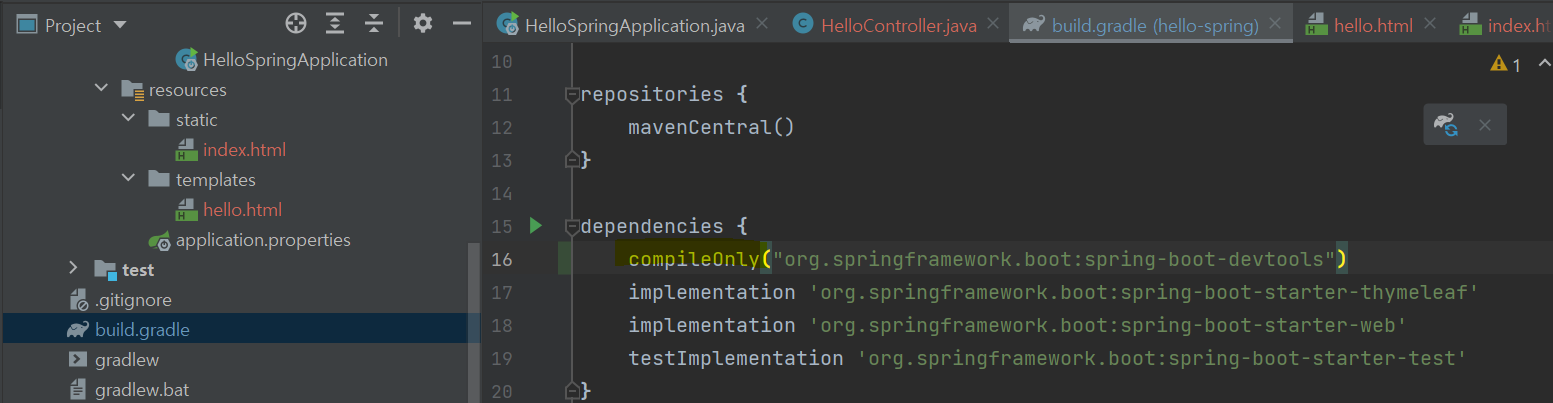 01. build.gradle์ ๊ฐ์ depencency์ compileOnly("org.springframework.boot:spring-boot-devtools") ์ถ๊ฐ