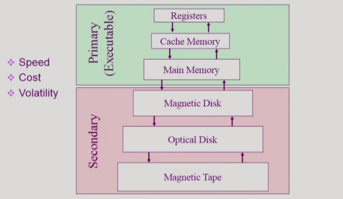 - secondary memory์ ๊ฒฝ์ฐ ๋นํ๋ฐ์ฑ, primary memory์ ๊ฒฝ์ฐ ํ๋ฐ์ฑ ๋งค์ฒด๋ก ๊ตฌ์ฑ๋์ด ์์