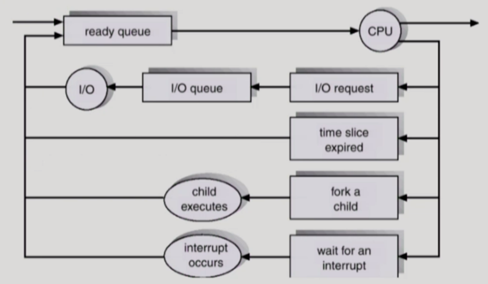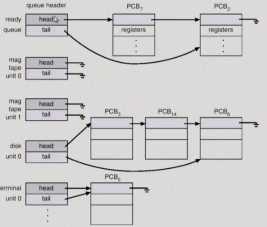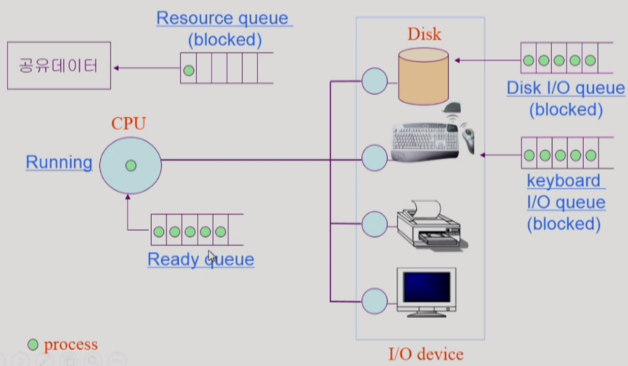 3) Device Queues : I/O device์ ์ฒ๋ฆฌ๋ฅผ ๊ธฐ๋ค๋ฆฌ๋ ํ๋ก์ธ์ค์ ์งํฉ