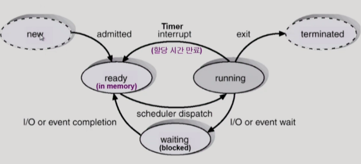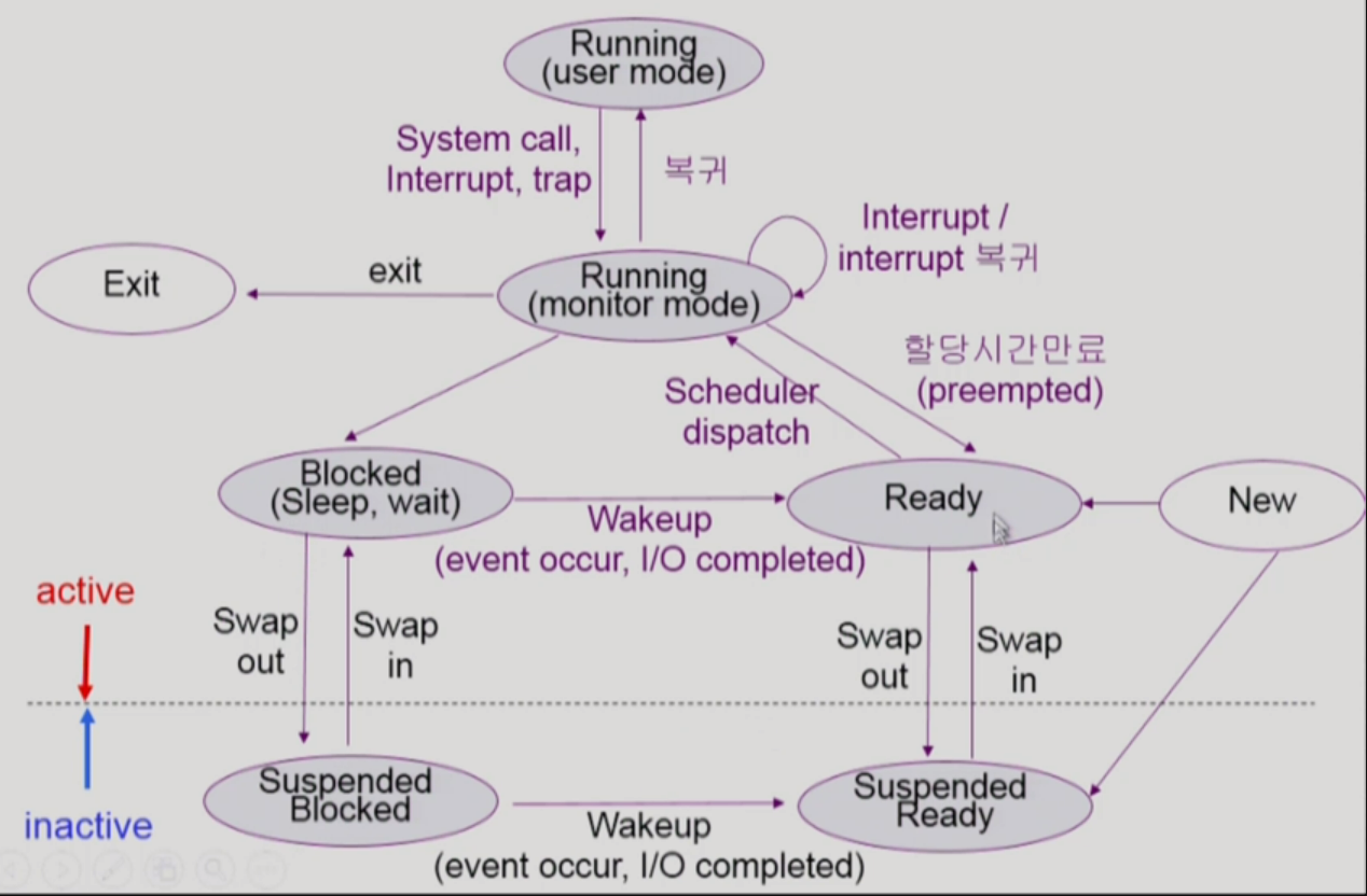 * Blocked : ์์ ์ด ์์ฒญํ event๊ฐ ๋ง์กฑ๋๋ฉด ready (์ผ์ ํ๊ณ ์์)