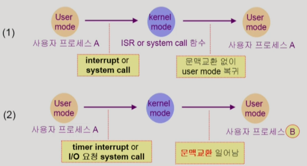 (์ฌ์ฉ์ ํ๋ก์ธ์ค -> ์ด์์ฒด์ ๋ก CPU ๋์ด๊ฐ)