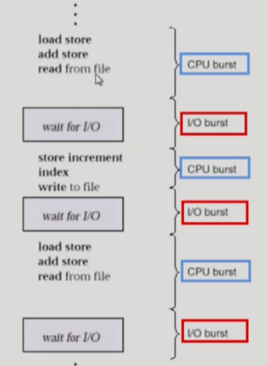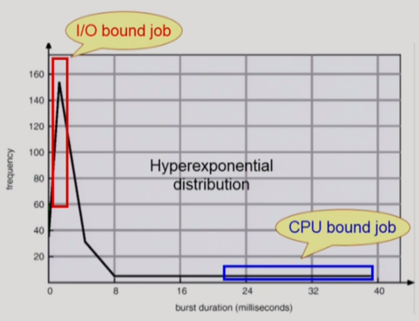 - many short CPU bursts(์ค๊ฐ์ I/O๊ฐ ๋ผ์ด๋ฆ)