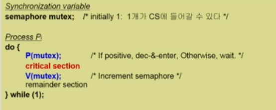 - mutual exclusion : shared data์ mutual exclusion(binary semaphore ํ์)