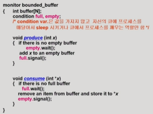semaphore์์๋ ๋ณ์๊ฐ ๊ฐ์ ๊ฐ์ง์ง๋ง, monitor์์๋ ๋ณ์๊ฐ ๊ฐ์ ๊ฐ์ง์ง ์๋ ๋์ ์กฐ๊ฑด ๋ง์กฑ ์ฌ๋ถ๋ฅผ ๊ฐ๋ฐ์๊ฐ ์ฒดํฌํ๋ค