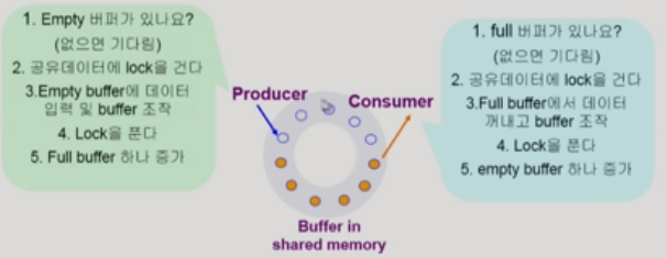 1) shared data : buffer ์์ฒด ๋ฐ buffer ์กฐ์ ๋ณ์(emtpy/full buffer์ ์์ ์์น)