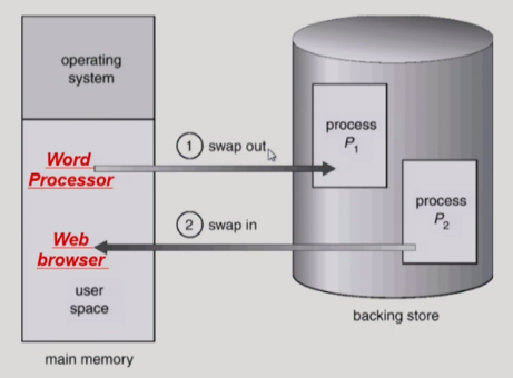 - Swapping : ํ๋ก์ธ์ค๋ฅผ ์ผ์์ ์ผ๋ก ๋ฉ๋ชจ๋ฆฌ์์ backing store๋ก ์ซ์๋ด๋ ๊ฒ