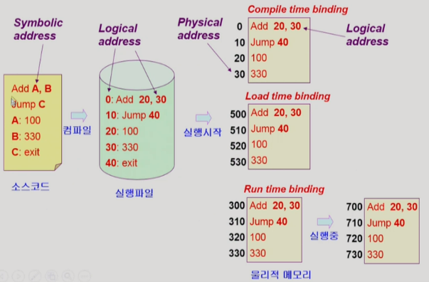 (Symbolic addr(๋ณ์/ํจ์๋ก ํธ์ถ) -> Logical addr -> Physical addr)