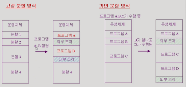 - external fragment (ํ๋ก๊ทธ๋จ ํฌ๊ธฐ > ๋ถํ ์ ํฌ๊ธฐ) : ํ๋ก๊ทธ๋จ์ด ์ฌ๋ผ๊ฐ ์ ์๋ ์์ ๋ถํ ํต์งธ