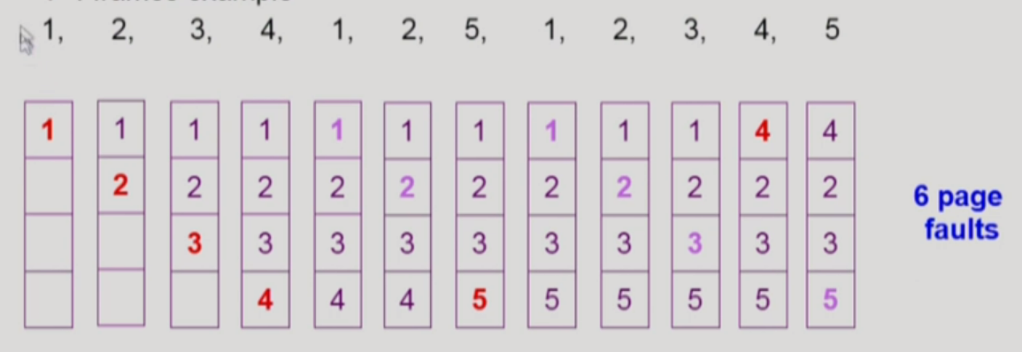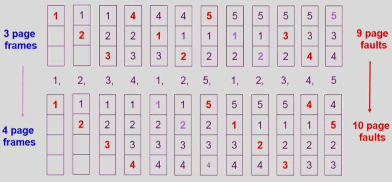 FIFO anomaly(belady's anomaly) : more frames != less page faults