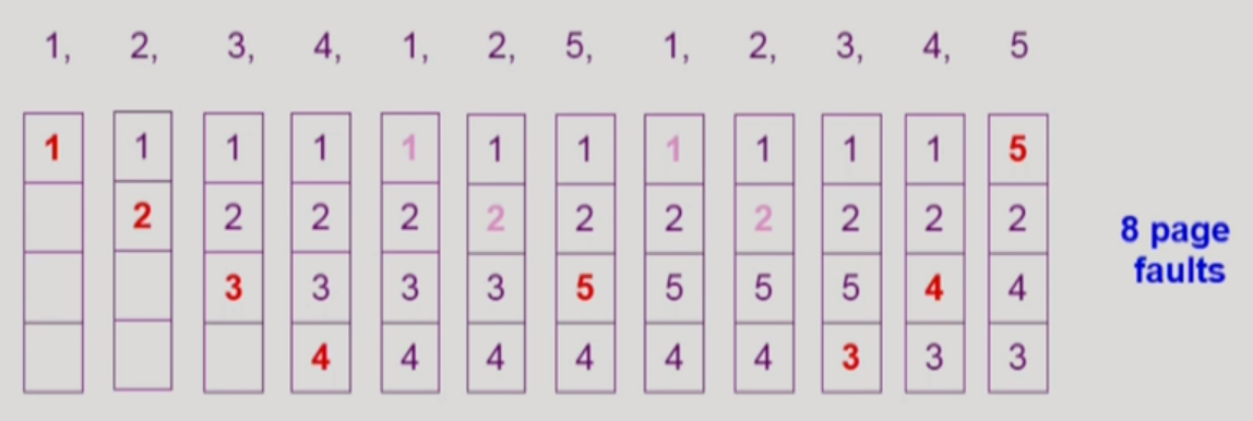 FIFO anomaly(belady's anomaly) : more frames != less page faults