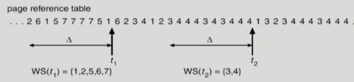 - working set window๋ฅผ ํตํด ์์๋ (๊ณผ๊ฑฐ delta ์๊ฐ ๋์ ์ฐธ์กฐ๋ page = working set window)
