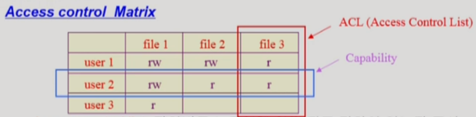 - access control list : ํ์ผ๋ณ๋ก ๋๊ตฌ์๊ฒ ์ ๊ทผ ๊ถํ์ด ์๋์ง ํ์