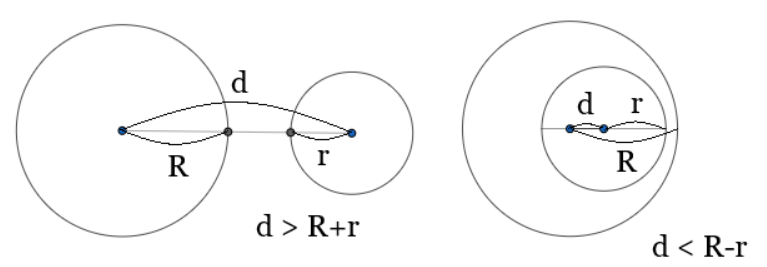 ์ค์ฌ ๊ฐ์ ๊ฑฐ๋ฆฌ๊ฐ 0์ด๊ณ ๋ฐ์ง๋ฆ์ด ๋์ผ(D==0, R==r)